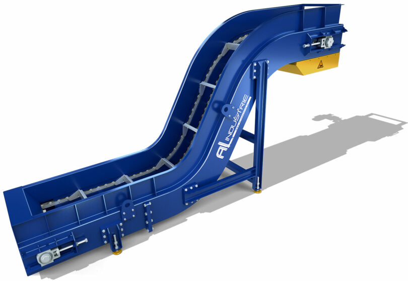 The R100 conveyor is equipped with a 100 mm pitch double chain with scraping blades. This is the model most widely used in heavy industry for high-volume bulk evacuation.