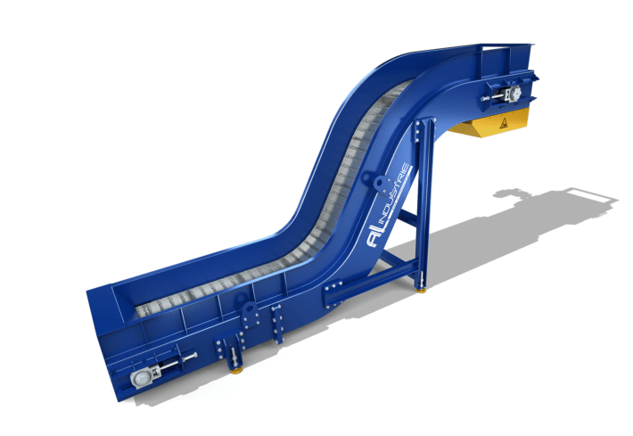 The material to be conveyed is transported on the upper part of the metal-hinged belt. Bars are used to transport it on the incline until it is unloaded. When cutting fluids are used, they are collected in the box and pumped back into the machine tank via the drip tray or a pump.