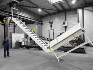 Le convoyeur mesurant 20 m de long et 10 m de haut, nous lui avons intégré une tête renforcée qui permet d’installer deux moteurs. En effet, ce modèle a besoin d’une grande force d’entraînement au vu de sa taille.