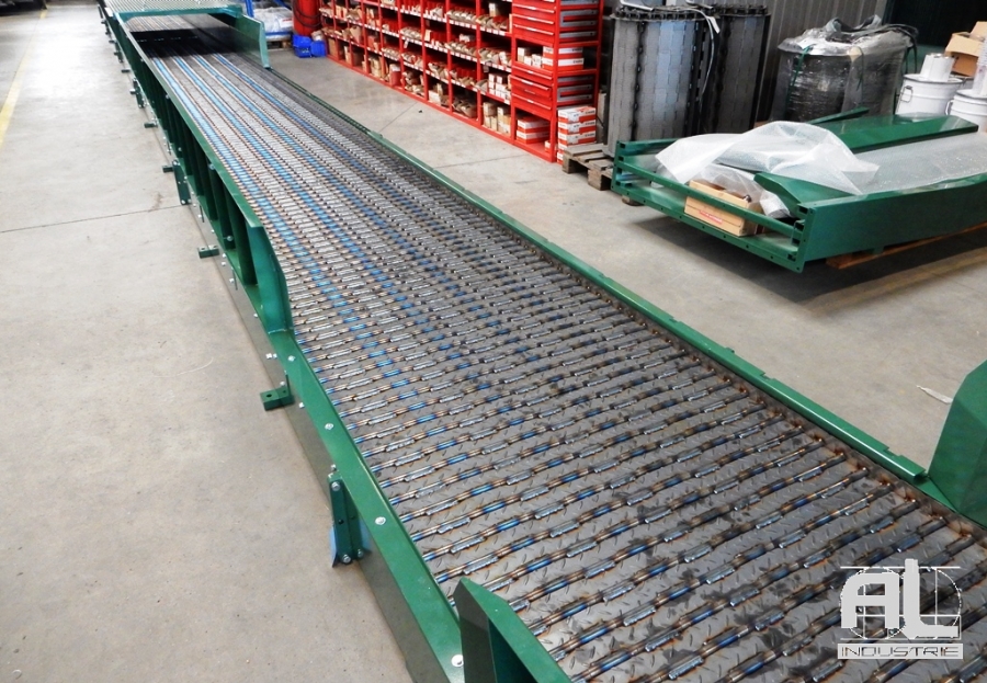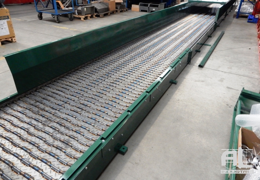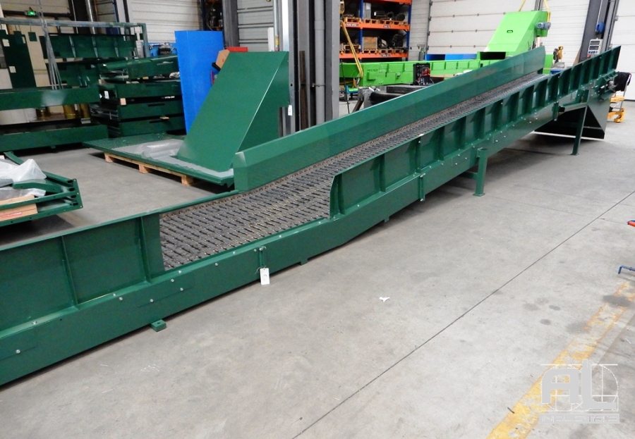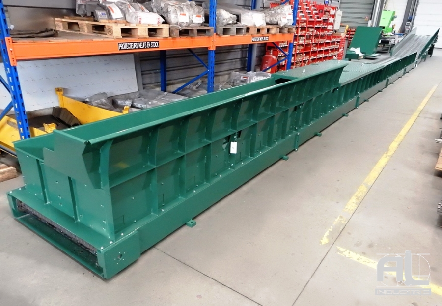 Machine de découpe laser Trumpf de 25 m de long équipée de deux convoyeurs de récupération de pièces. Cette machine sert à la découpe de capots aluminium pour véhicule de grandes marques. Les convoyeurs sont équipés d’un tapis métallique haute résistance afin de résister aux chutes de tôles pouvant atteindre 3 m de long et chutant de 1.5 m de haut. Le tapis métallique d’une largeur de 1 m est également équipé de maillons d’épaisseurs 5 à 8 mm.