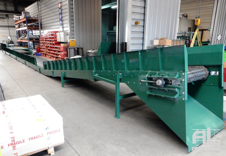 Convoyeurs à tapis conçus, fabriqués et installés par AL Industrie sur une machine de découpe laser Trumpf de grande dimension.