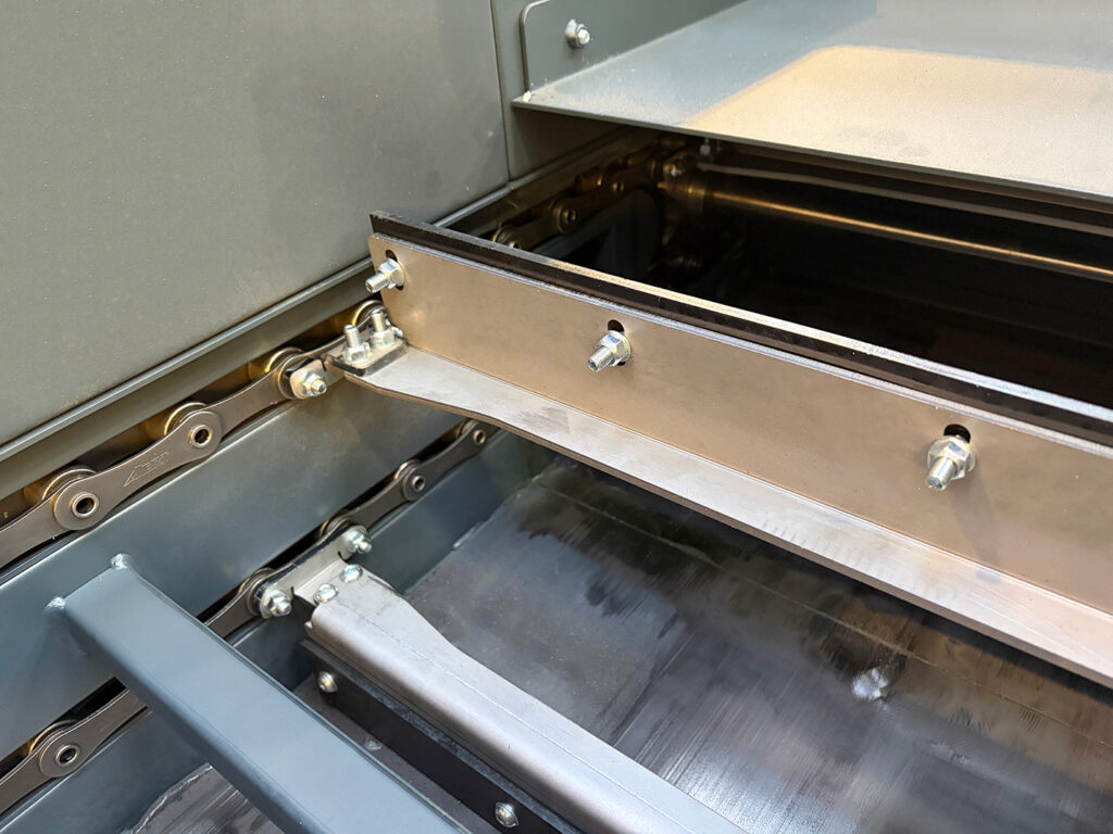 Pour ce projet, nous avons sélectionné un convoyeur modulaire de gamme 800, notre modèle standard le plus large, afin de garantir un transport efficace et régulier de la sciure. L’équipement intègre des raclettes électrozinguées de largeur utile 800 mm, technologie particulièrement adaptée à ce type d’application. Ces raclettes sont montées sur une chaîne au pas de 63 mm, avec des barrettes positionnées tous les 5 pas, assurant un entraînement stable et homogène de la matière.