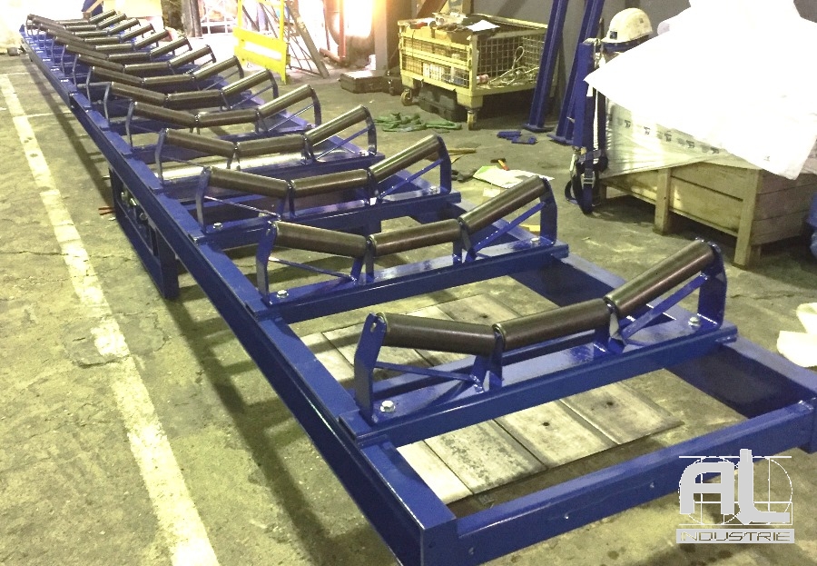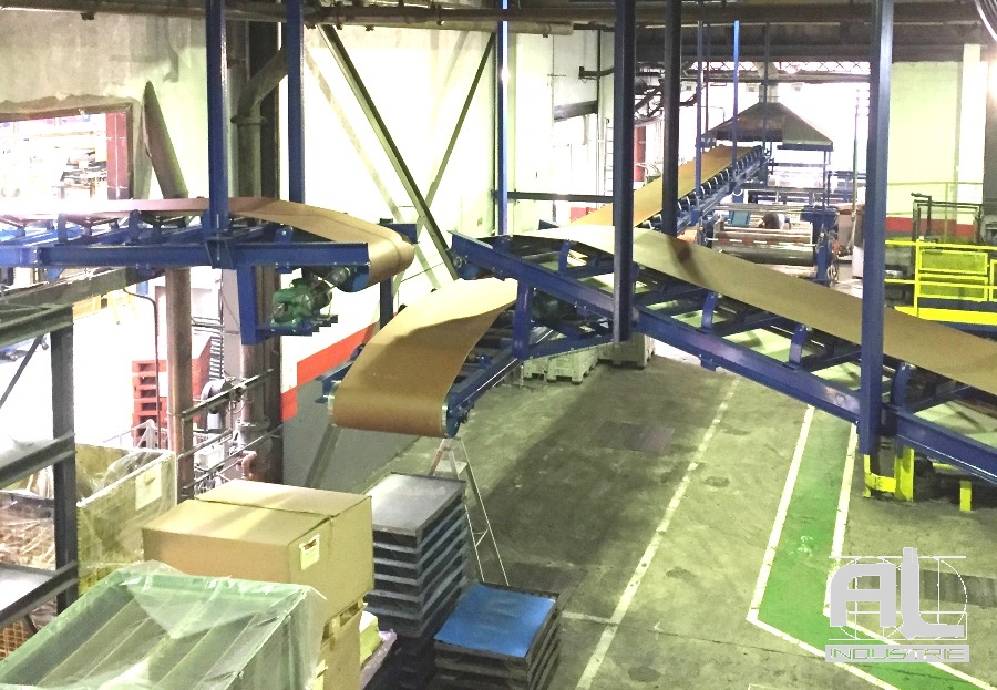 Convoyeurs à bande en auge pour le transport de matière caoutchoutée.