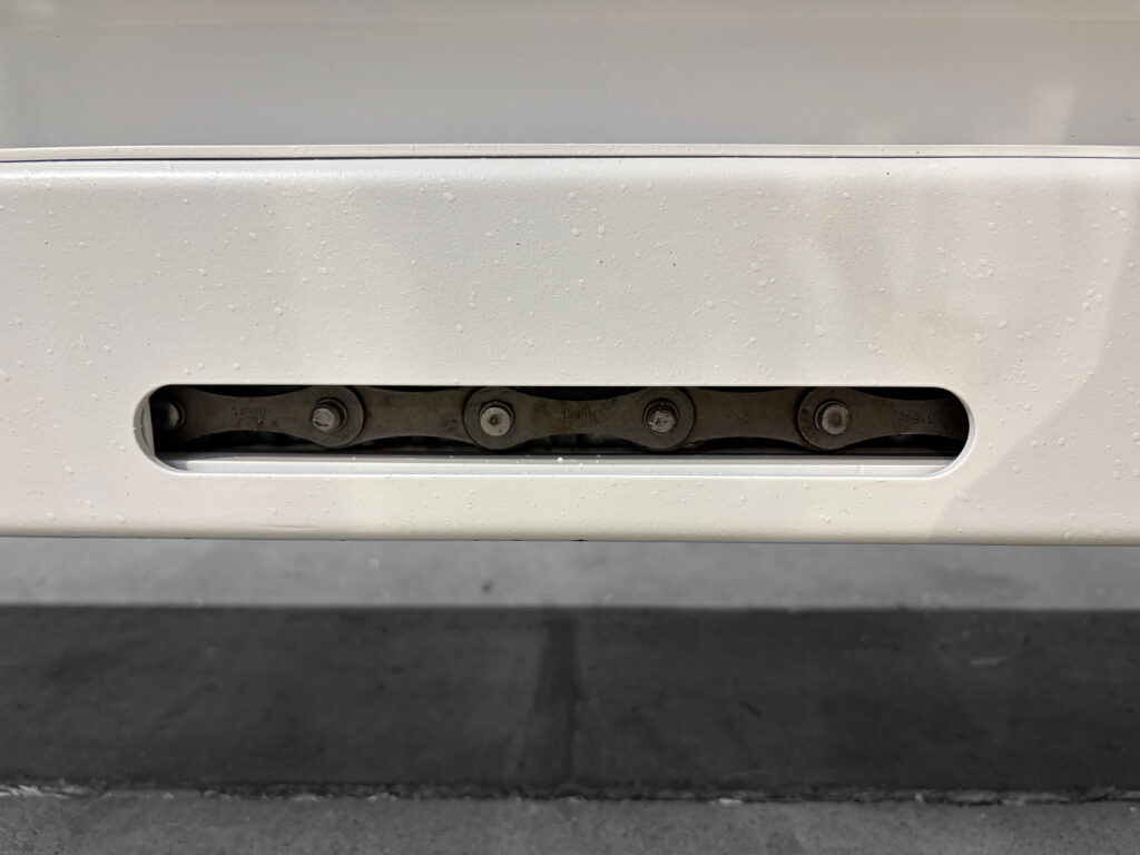 Pour répondre aux contraintes spécifiques de cette application, nous avons équipé le convoyeur d’un tapis métallique lisse au pas de 38 mm. Cette technologie est particulièrement adaptée au type de copeaux transporté, garantissant une évacuation fluide et fiable.
