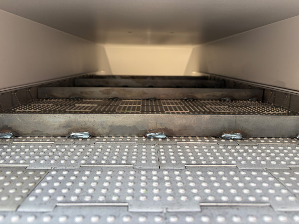 Le convoyeur est équipé d’un tapis martelé avec une chaîne au pas de 63 mm. Des barrettes ont été ajoutées tous les 5 pas afin d’assurer un convoyage optimal de la matière et d’éviter les glissements de pièces lors de la remontée.