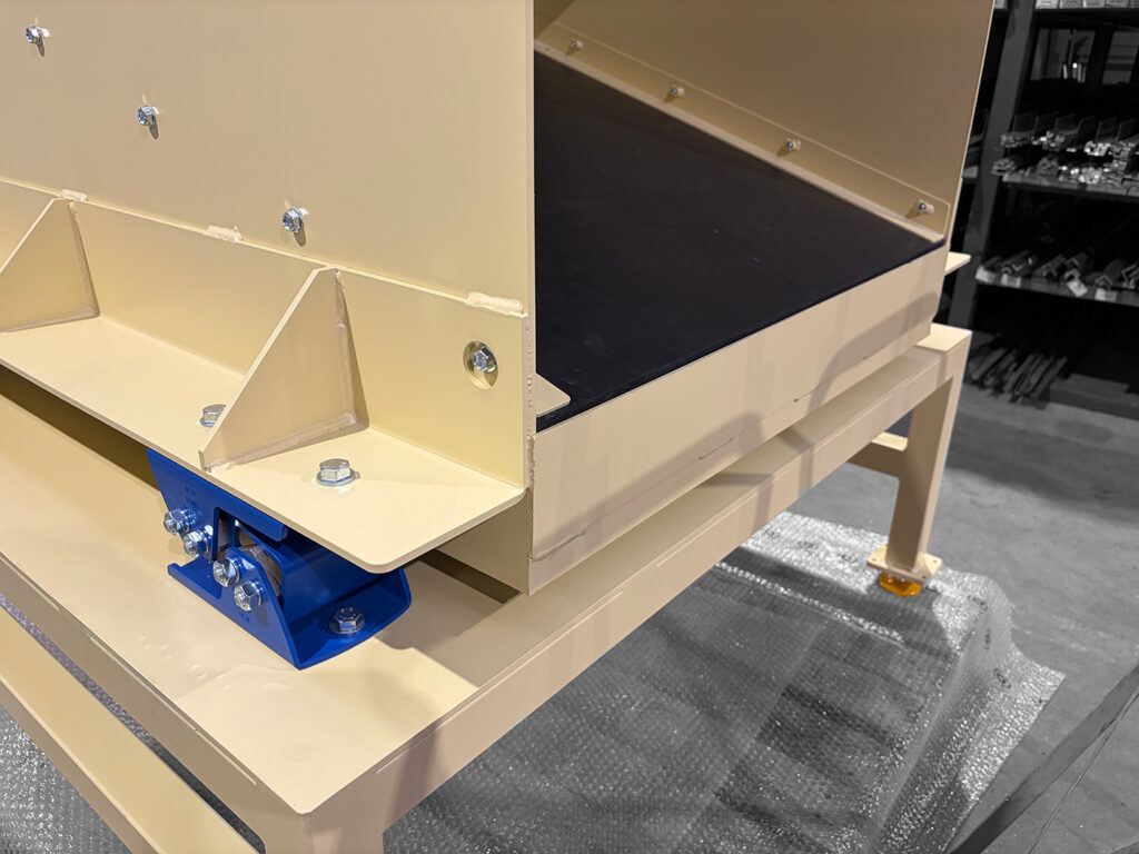Destinée à recevoir des chutes de différentes tailles et pouvant atteindre jusqu’à 30 kg par pièce, la trémie a été spécifiquement conçue pour freiner et maîtriser l’arrivée des pièces avant leur prise en charge par le convoyeur. Cette fonction est essentielle pour préserver le tapis métallique renforcé, garantir la stabilité des chutes dès leur réception et assurer un convoyage fluide, même en fonctionnement intensif.